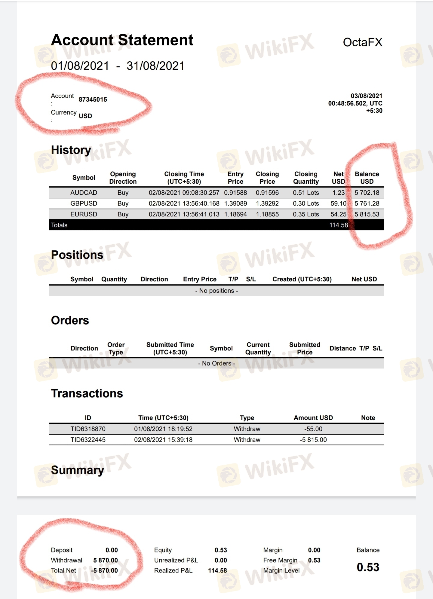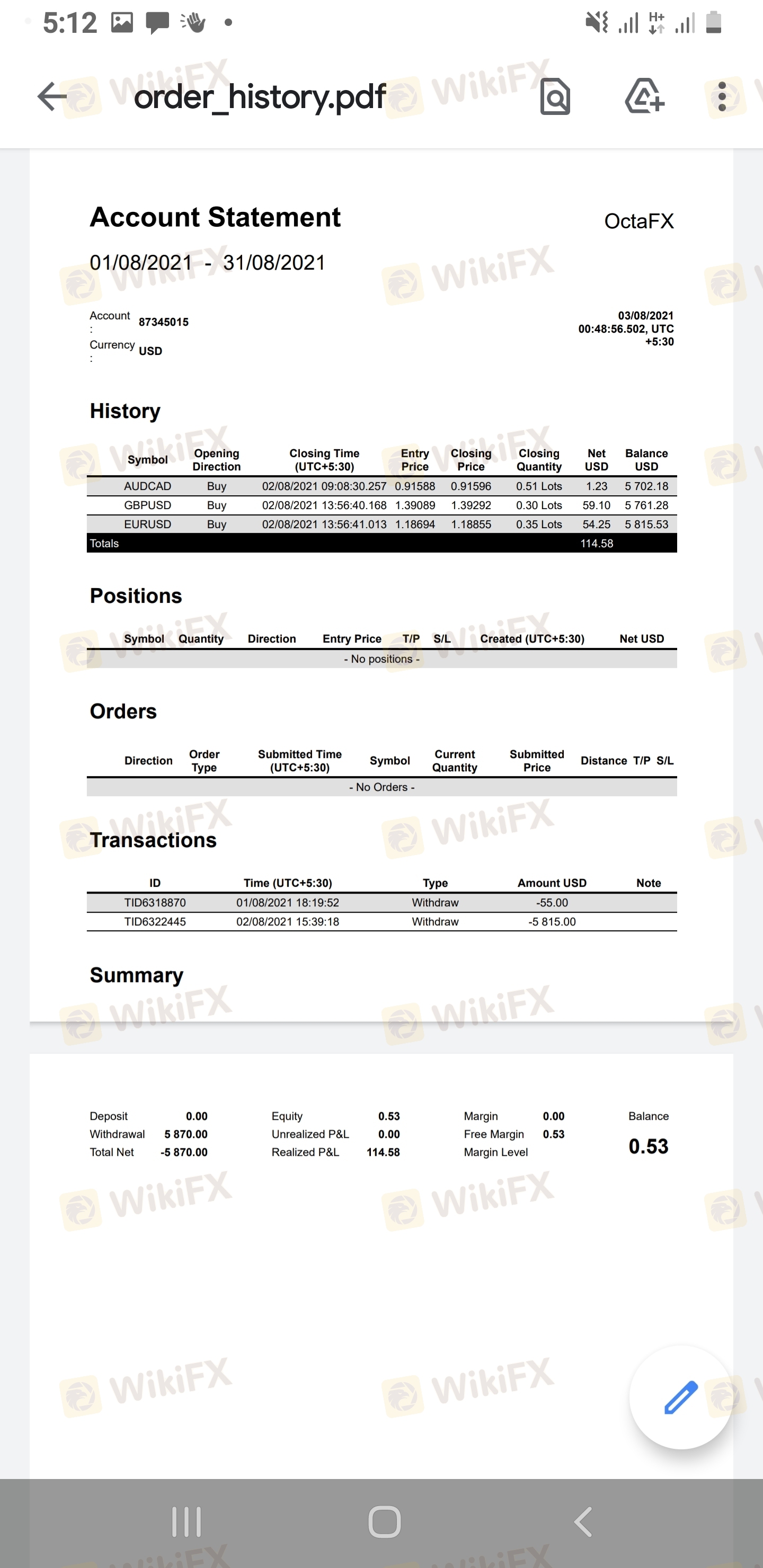 So i deposited 5755$ for trading into octafx. withdrew 55$ , i received that. i felt ok with trading now. traded with $5700, opened 3 trades gained around 115$ profit. when i go to withdraw the 5815$ amount, after a hour or so, they give a confirmation email stating that your withdrawal is complete..but even after 12+ hours, i have not received 5815$ in my crypto ETH wallet. i shall be attaching my order history, withdrawal status and etherscan wallet information.