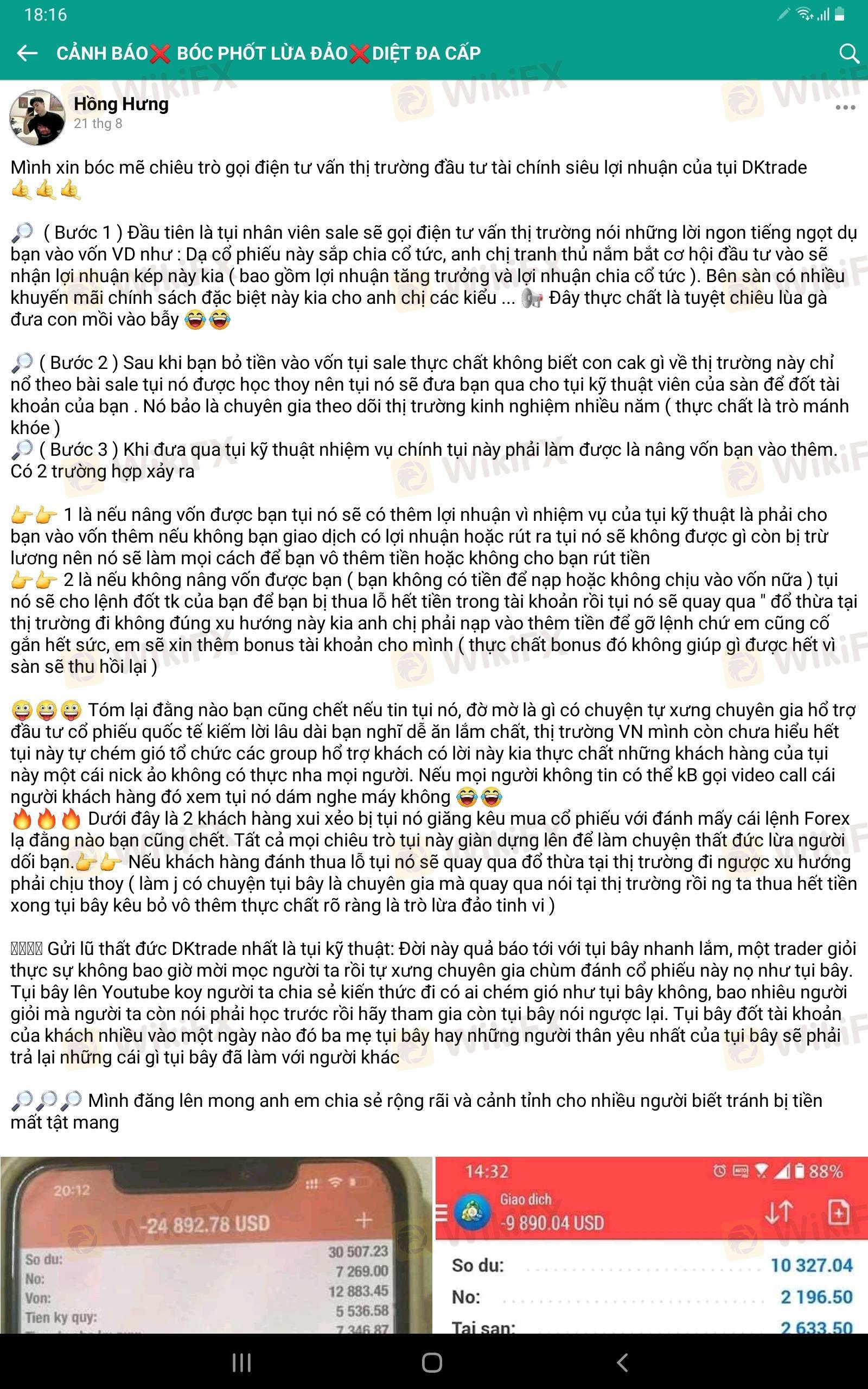 Tôi đã bị cháy hơn 13000 USD, khi kỷ thuật sàn cho lệnh với cổ phiếu INGO, đi lệnh 2,5 Lot.Tôi nghĩ 2.5 là nhỏ, giờ tìm hiểu mới biết 1 lot = 1000 cổ. 2,5 lot = 2500 cổ, giảm 1 giá là mất 2,5 k, vì vậy tài khoản cháy là đúng rồi. Tôi vào facebook, lên goole đều thấy nhà đầu tư viết bài về DK trade là lừa đảo, làm cháy tài khoản, tôi mới hiểu ra là lừa toàn hệ thống. Nhiều người bị ko chỉ riêng tôi, nay tôi viết bài này để các nhà đầu tư cân nhắc, đừng nghe theo lời ngon ngọt của nhân viên sale.