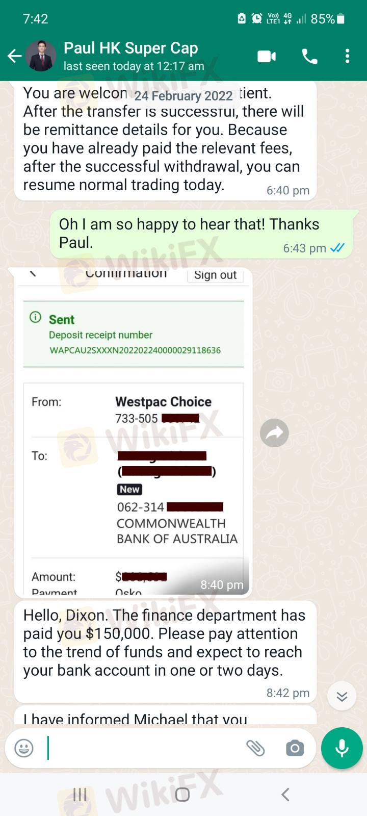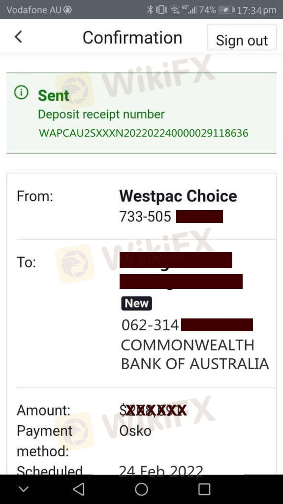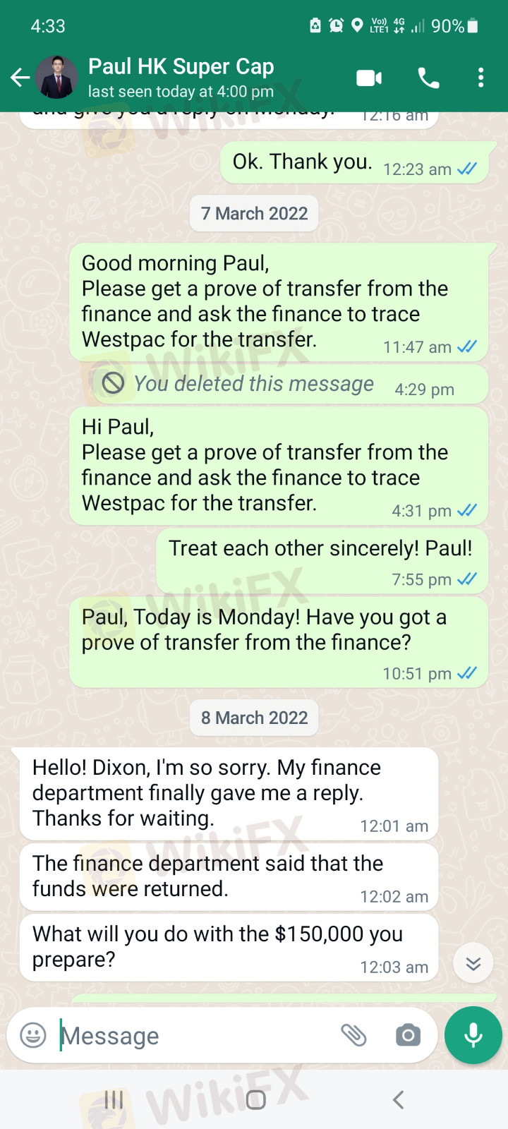 Pada 24 Feb 2022, saya diberikan tangkapan layar transfer untuk penarikan saya sebesar 150.000 USD dari Skyam Invest. Setelah menunggu selama 12 hari dana masih belum sampai ke rekening saya! Pada 8 Maret 2022, Paul dari Skyam memberi tahu saya bahwa dana tersebut dikembalikan dan menanyakan apa yang ingin saya lakukan dengan dana tersebut. Saya ingin keuangan mengirim ulang dana ke akun saya hari ini karena telah tertunda selama lebih dari 2 minggu sejak 24 Februari 2022.