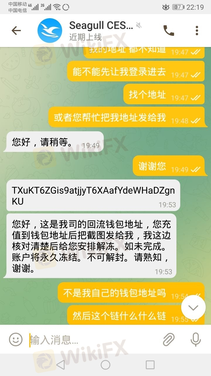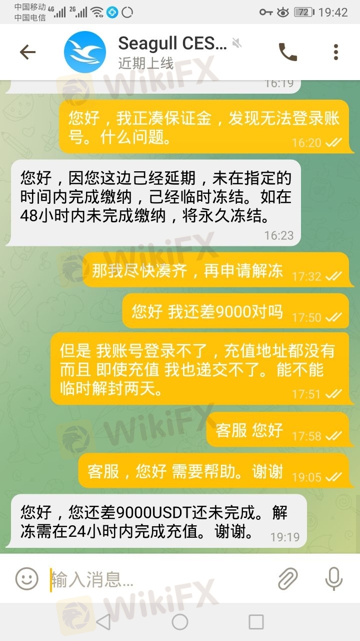 本人 于2022年4月9日,在电报群经陌生人推荐到SEAGULL交易所(注册在开曼群岛)注册账号,并转USDT到个人注册的账号,进行BTC的合约交易。SEAGULL 交易所APP下载地址:https://m.seagull-crypto.com/#/pages/settings/index SEAGULL交易所网站:https://seagull-crypto.com 期间也下载了并浏览了SEAGULL的白皮书。 在完成注册后,即进行了合约操作,在小有盈利的情况下,在4月9日顺利提了100 USDT,后逐渐加大仓位,最终在5月1号的投入达到USDT 8.7 万。 个人在交易所的账号的充值地址:USDT 链类型 TRC-20的充值地址为: TFKZo8yNbcr3i84KUCap3PVU1LjiLbTWEd 在4月9日至5月1号期间,本人不间断进行存入USDT并合约操作。5月1日,北京时间晚上10点多成功提取了5000USDT后,5月2日再申请提取5000美金,即无法提取,显示账户异常。经询问在线客服后,在线客服给了一个电报客服的联系方式 SEAGULL CES 064进行交流。电报客服说是本人涉嫌洗钱,非法套取平台资金等一系列子虚乌有的理由,同时要求我需存入盈利20%的风险金到个人账号,经风控部门核实后,才可以提币。(详细内容可参客服与我直接的聊天截屏)此时,我才明白过来,SEAGULL交易所就是一个专门骗人的交易所,小额盈利可以提取,大额全部限制。和客服沟通,无力承受存入20%盈利的风险金,自愿放弃全部收益,仅述求取回本金,但均被拒绝。后本人又筹借了2万多的U存到客户指定的地址,然后客户说3天后可以提取,过了3天后,尝试提取失败,客户又说需要缴纳20%盈利税大概15000U才可以,否则48小时后冻结账户,而后在没有存入相应的金额后,账户被限制登录,永久冻结,电报客服也被删。希望各位以我为戒,切不可相信他人带你赚取的诱导,不可在电报群相信任何陌生人,远离SEAGULL交易所。本人总共损失了10.7万U.