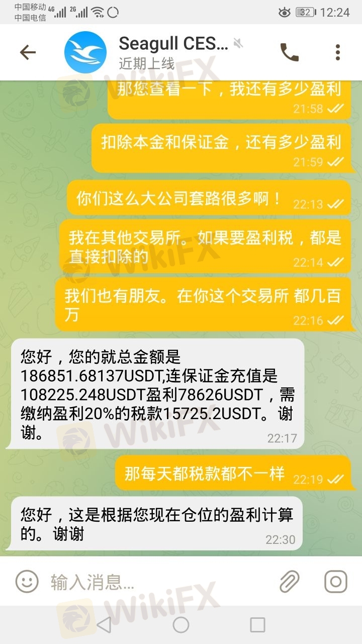 带单骗局,要求保证金和盈利税,总共40%,然后未缴纳,直接关闭账号,大家务必远离seagull交易所