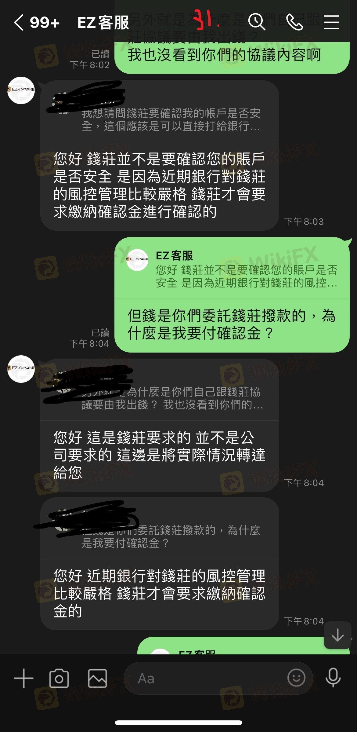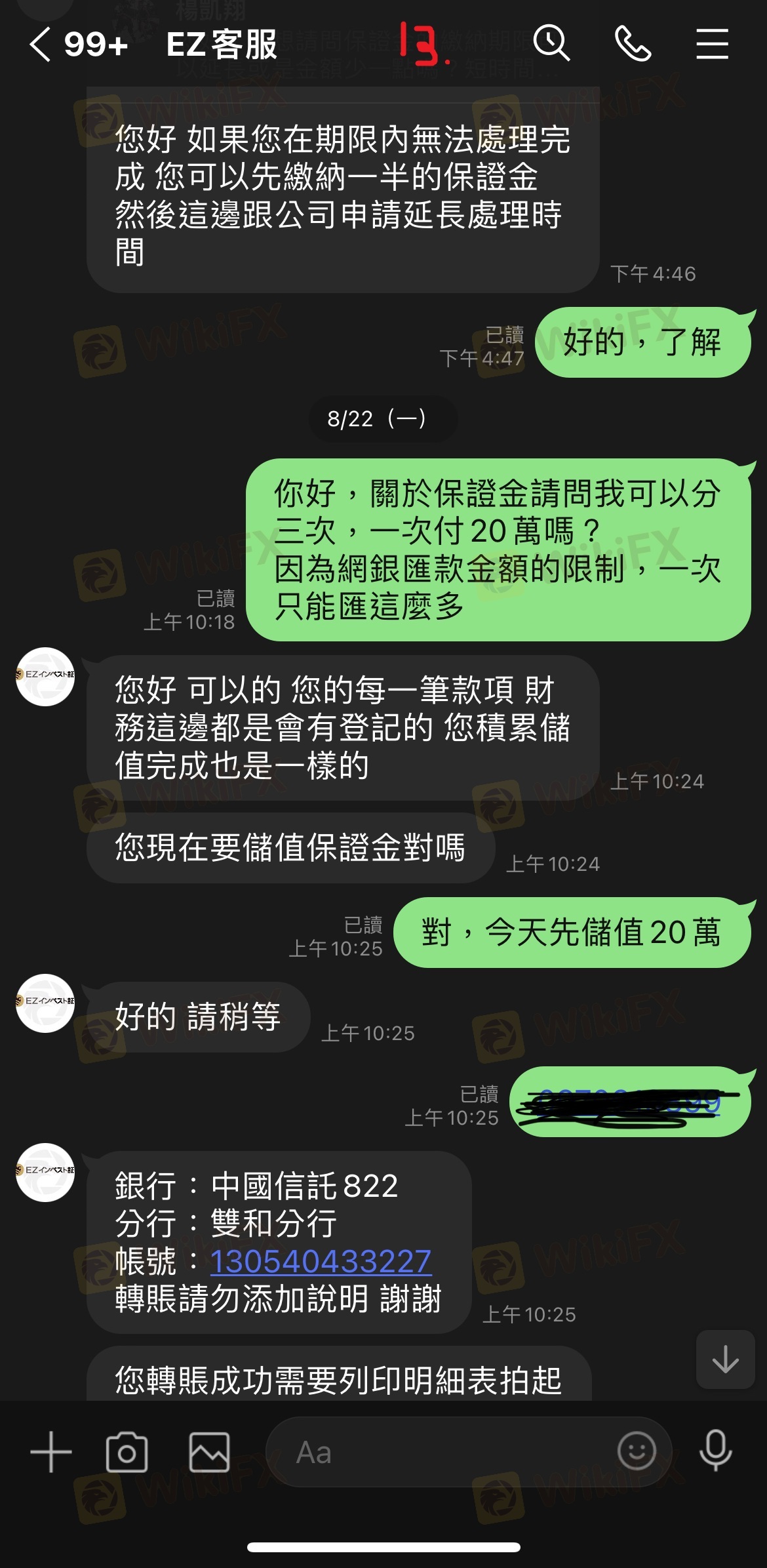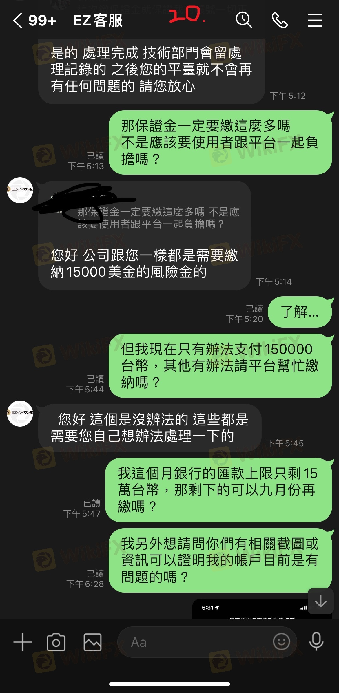 最初因為申辦帳戶VIP及解決凍結帳戶問題已繳一大筆錢,之後又說是我的帳戶有問題無法出金我所需要的金額,需要先出清所有帳戶內款項並擅自交由錢莊匯款,後來又說錢莊要求繳交確認金才能匯款,最後詢問繳交問題卻都已讀不回