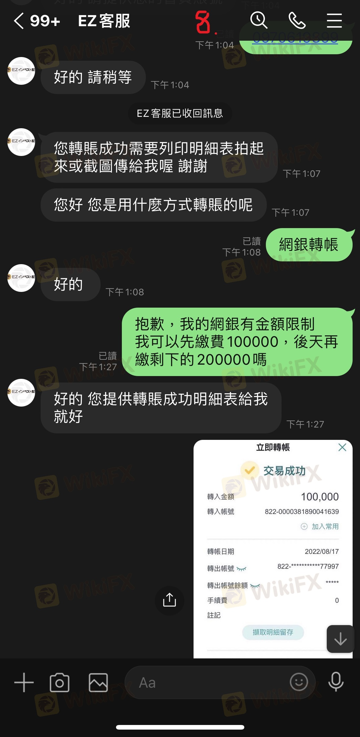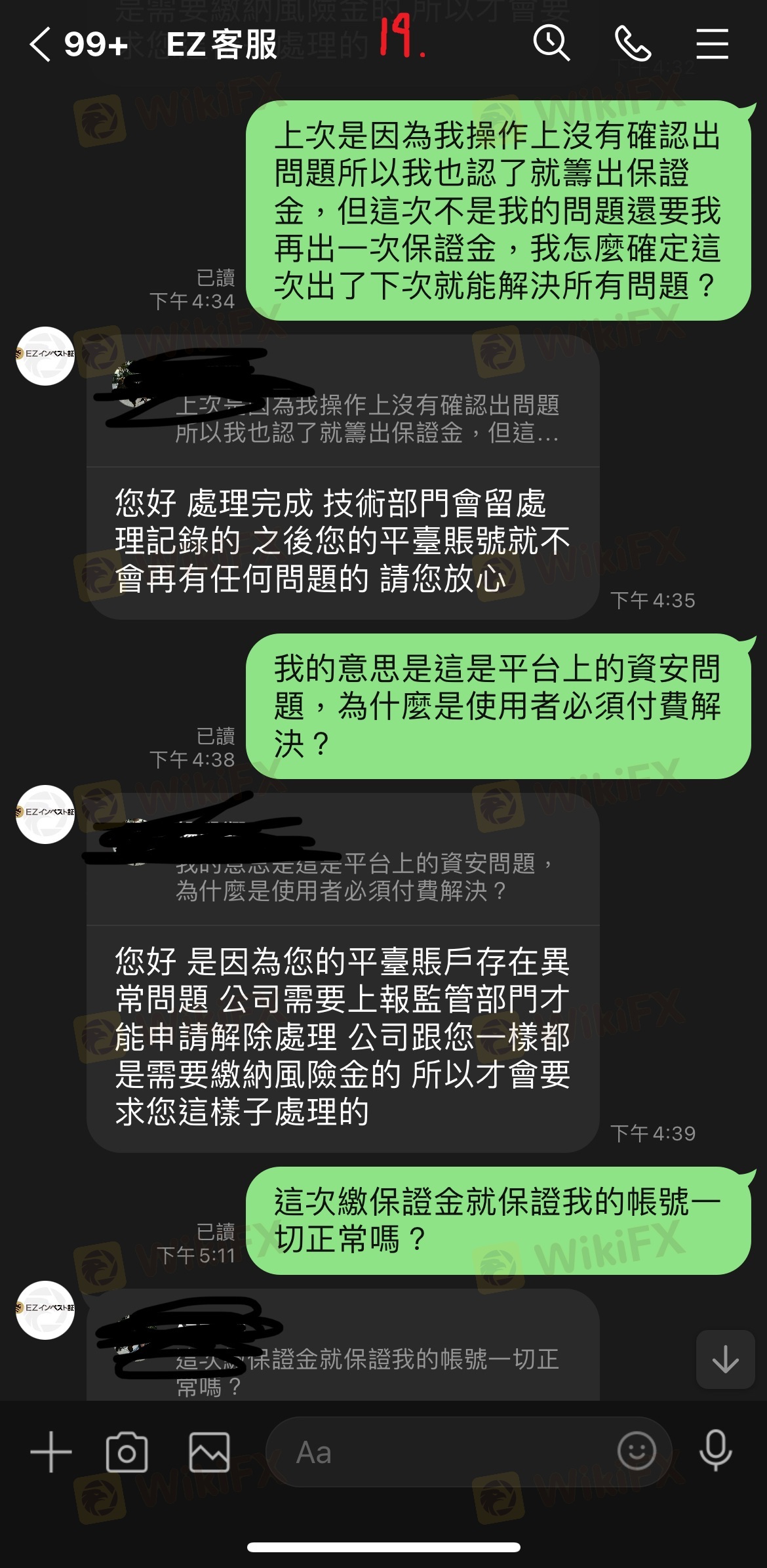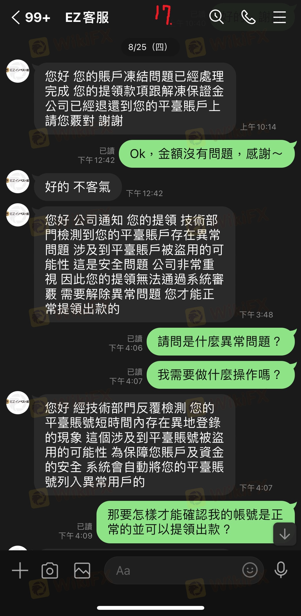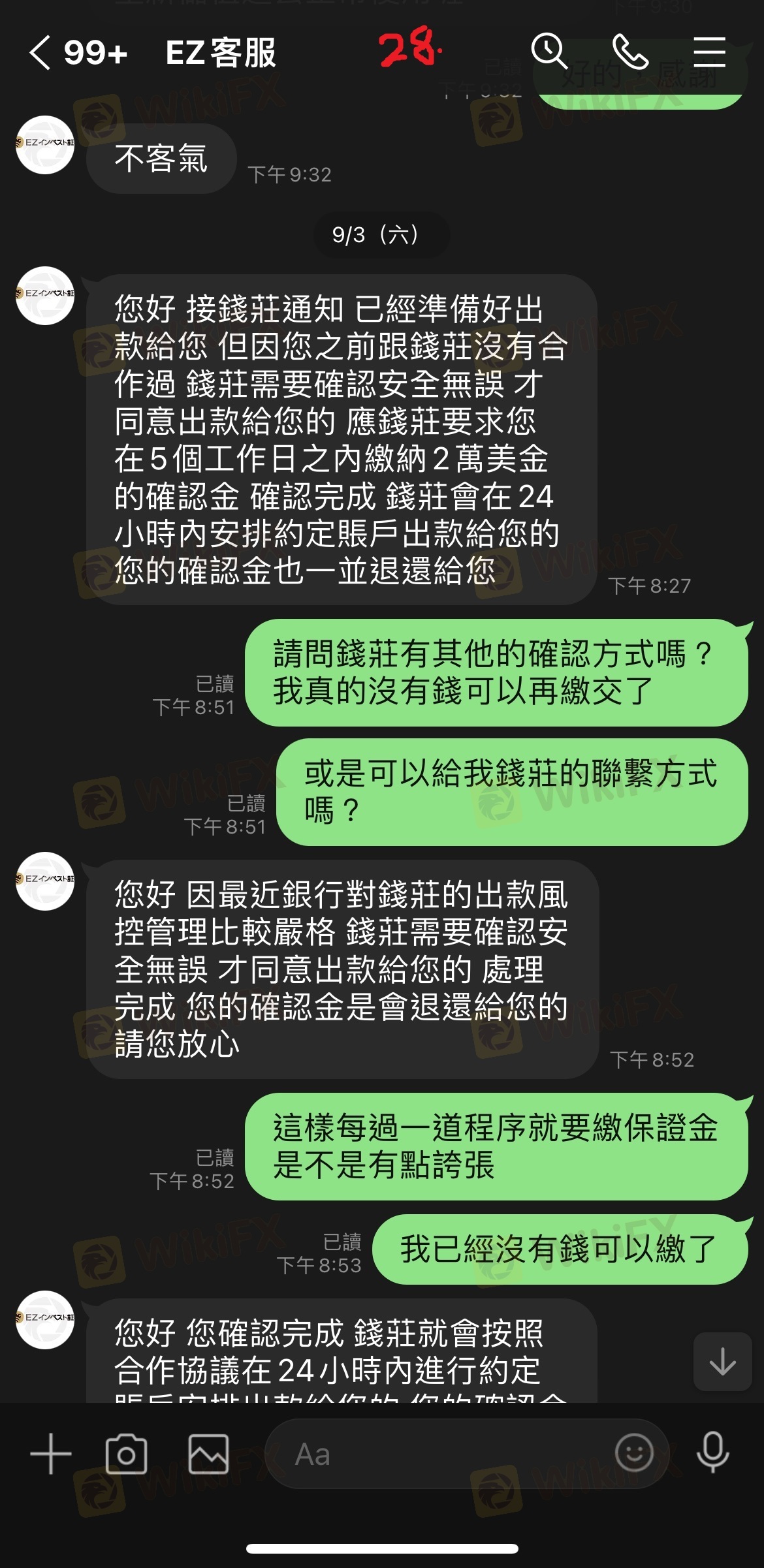 最初因為申辦帳戶VIP及解決凍結帳戶問題已繳一大筆錢,之後又說是我的帳戶有問題無法出金我所需要的金額,需要先出清所有帳戶內款項並擅自交由錢莊匯款,後來又說錢莊要求繳交確認金才能匯款,最後詢問繳交問題卻都已讀不回