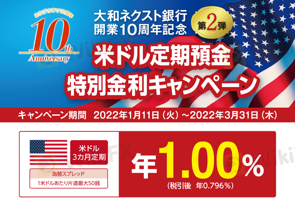 キャンペーンのご利用条件 ◆対象となるお客さま 「ダイワのツインアカウント」をお持ちの「ダイワ・コンサルティング」コースの個人、法人のお客さま ※上場事業法人・金融法人のお客さまは対象外となります。 ◆預入金額 米ドル:1万米ドル~500万米ドル ※預入単位は、1補助通貨単位です。 ※キャンペーン期間中、1万米ドル以上500万米ドル以下の範囲で何度でもお預入れいただけますが、合計で500万米ドルが上限となります。 ◆対象資金 以下の①または②のいずれかのご資金で新たに外貨普通預金にお預入れいただき、当該お預入れ金額の範囲内で3カ月定期預金へお預入れいただく場合 ①他社・他行から大和証券または大和ネクスト銀行へ外貨にて入金されたご資金 ②大和証券で円から米ドルへの外国為替取引をされたご資金 ※他社・他行からの外貨送金は、2022年1月11日(火)~2022年3月31日(木)着金・預入完了分を対象とします。 ※外国為替取引は、2022年1月11日(火)~2022年3月31日(木)受渡し・預入完了分を対象とします。 ※一度ご出金された外貨預金を再度お預入れされる等、大和証券が不適切と判断した場合には、キャンペーン金利の適用対象とならない場合がございます。 ◆お取扱窓口 大和証券の本・支店、営業所にてお申込みください。 ※インターネットおよびコンタクトセンターでは受付けておりません。