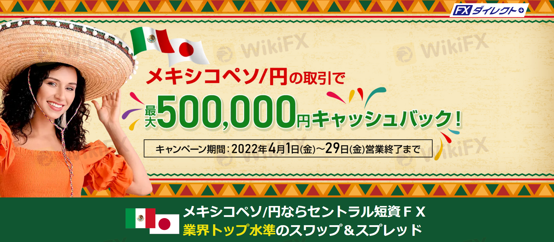キャンペーン内容 キャンペーンに申し込まれたお客さまに、期間中におけるFXダイレクトプラスでのメキシコペソ/円の新規取引合計数量に応じて、最大500,000円をキャッシュバックします。 例えば… 新規取引合計数量が500万通貨 1,000円キャッシュバック 新規取引合計数量が5,000万通貨 10,000円キャッシュバック 新規取引合計数量が50,000万通貨 100,000円キャッシュバック 参加方法 マイページのキャンペーンページからお申し込みください。 キャッシュバック時期 2022年5月末まで キャンペーン期間 2022年4月1日(金)~29日(金)営業終了まで