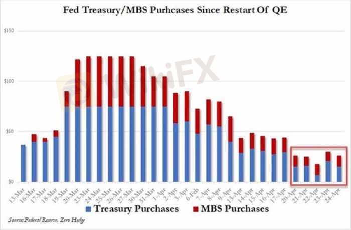 Согласно данным, опубликованным Reuters и Комиссией по торговле товарными фьючерсами США (CFTC) в прошлую пятницу (17 апреля), по состоянию на неделю 14 апреля нетто-шорты увеличились до $12,59 млрд долларов. Нетто-шорты на прошлой неделе составили 10,5 млрд долларов США. С тех пор, как ФРС первоначально запустила QE, ежедневные покупки сократились с $75 млрд. до $60 млрд. в день, а затем и вовсе снизились до 50 млрд. долл США в день. На прошлой неделе (12-17 апреля) закупки казначейства США были сокращены до 30 млрд долларов в день. Это показывает, что финансовая система США стабилизировалась, также это стало явным признаком того, что способность ФРС справляться с экстренным реагированием на внезапную вспышку показала высший класс.