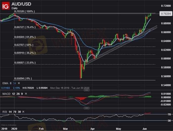 WikiFX считает, что связанный с рисковая валюта AUD продолжит расти против USD, валюты-убежища. Курс AUD/USD сейчас находится выше отметки 0,7000, и, поскольку рынок реализует V-образное восстановление, колебания обменного курса с начала года также считаются положительными. Ожидается, что AUD/USD преодолеет техническое сопротивление, которое является максимумом колебания 31 декабря 2019 года.