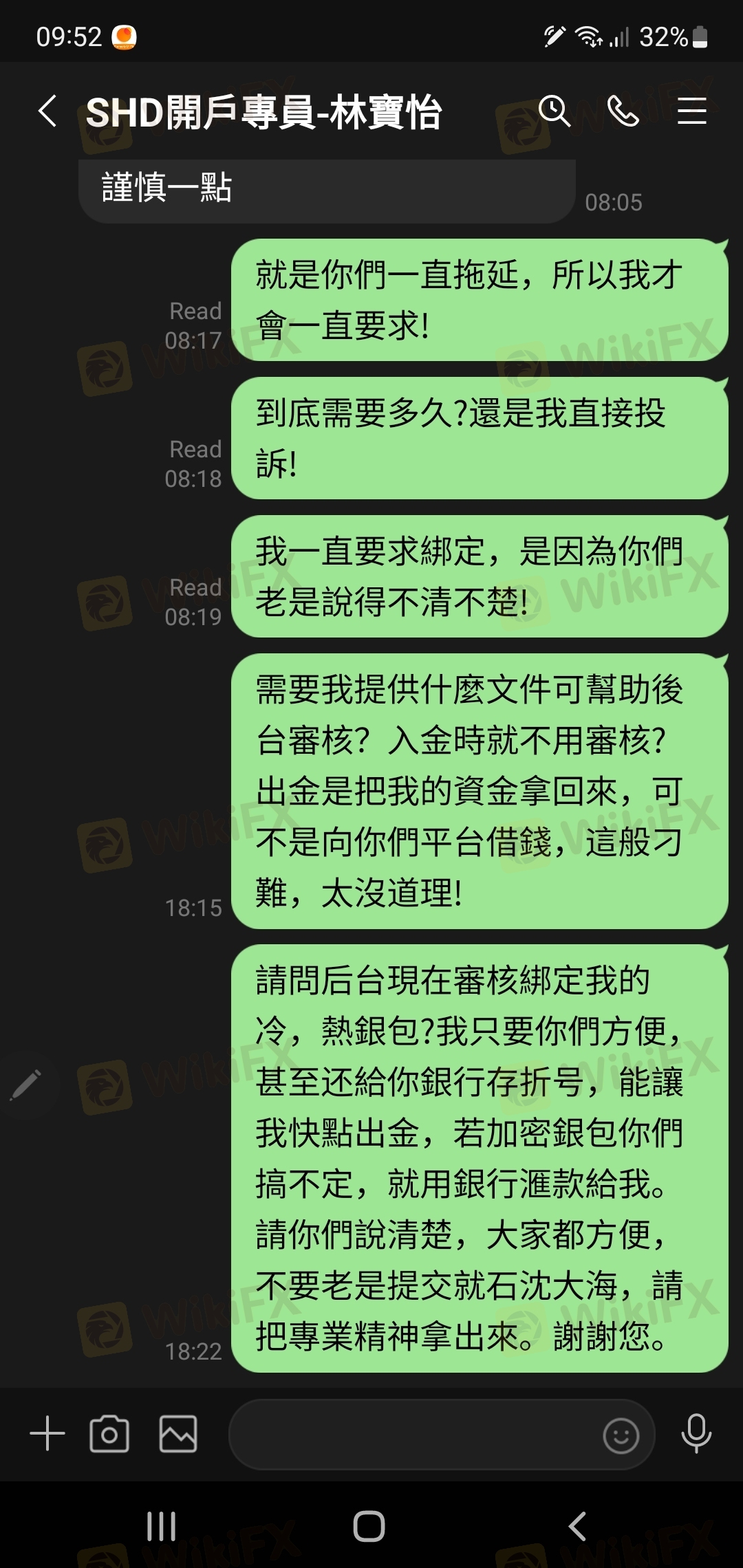 我向SHD平台申請出金已近三個月了,先以加密錢包地址錯誤不能綁定,我給了另一地址,拖了一個月沒結果,開户專員已不讀訊。我發电子郵件給聯絡中心申請也不回復,請客户服務核實,S HD又轉到另一客户經理,說出金要經會計審核,銀行審核....要求耐心等候,週復一週,月復一月,至今無法出金。 請你們向SHD要求調解,要回我的投資本金利得共18473美元,非常感謝。