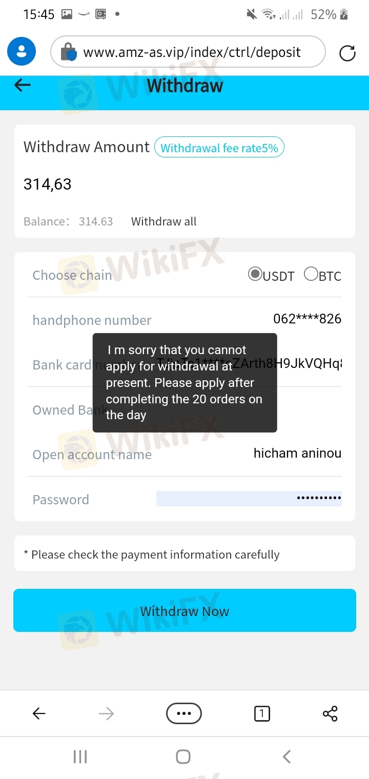 Tôi có tài khoản 300 đô la trong liên kết này (https://www.amz-as.vip/) nhưng họ không cho phép tôi yêu cầu rút tiền, họ yêu cầu tôi điền vào 600 đô la và thực hiện 20 Yêu cầu trong 24 giờ và khi có 5 yêu cầu họ yêu cầu tôi nạp tiền, vui lòng tôi rất cần sự giúp đỡ của bạn.