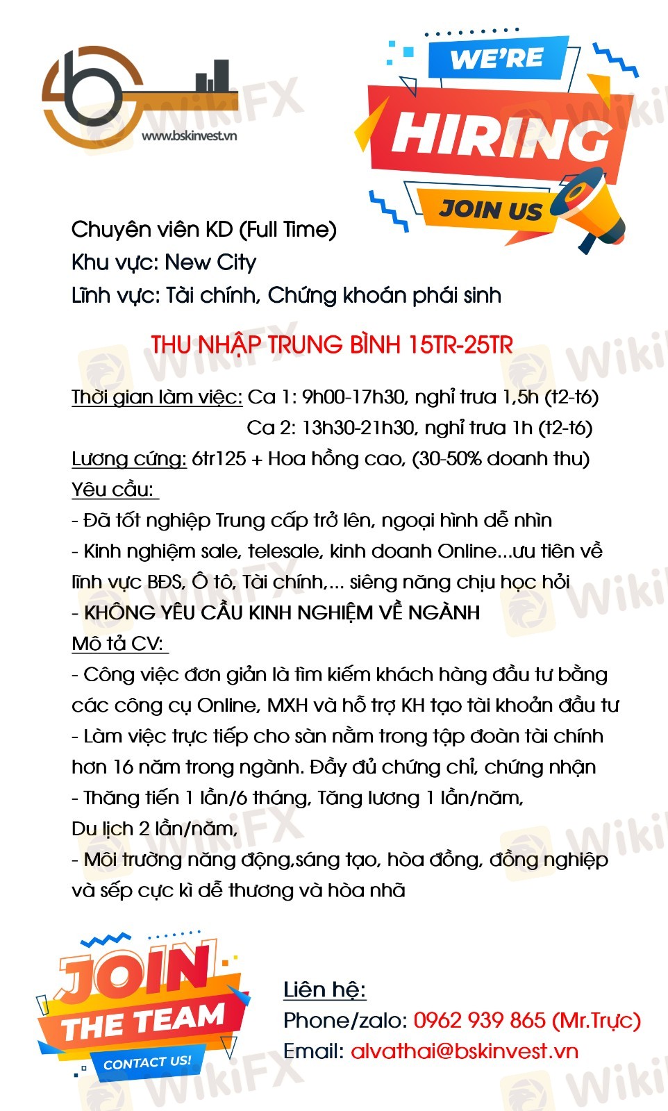 - Lương: 12.000.000 ++ ( lương căn bản: 6.15tr + hoa hồng cao + thưởng nóng ) - Thời gian làm việc: + Ca 1: 9h-17h nghỉ trưa 1,5 tiếng (từ Thứ 2 đến thứ 6) + Ca 2: 13h30-21h30 nghỉ chiều 1 tiếng (từ Thứ 2 đến thứ 6) - Thưởng lễ, tết, tháng 13, thưởng nóng theo tháng, teambuiding, party nội bộ, - Cơm trưa tại văn phòng ( không bao gồm trong lương) - Văn phòng làm việc: Khu đô thị New City Thủ Thiêm, văn phòng chuẩn, có view tha hồ sống ảo, hồ bơi cho các bạn thư giản - Du lịch trong và ngoài nước ít nhất 02 lần 01 năm, Party. - Được đào tạo, hướng dẫn, chia sẻ kinh nghiệm làm việc, kỹ năng chốt sale từ các tiền bối - Tham gia các khóa training ngắn hạn, hoặc dài hạn nâng cao trình độ, lĩnh vực của bản thân - Lộ tình thăng tiến rõ ràng có định hướng cho các bạn trẻ từng gian đoạn từ trưởng nhóm lên trưởng phòng... - Cơ hội tiếp xúc và tìm hiểu các loại hình, lĩnh vực đầu tư khác nhau trên thị trường - Đối với các bạn chưa có kinh nghiệm trong lĩnh vực sẽ được đào tạo.