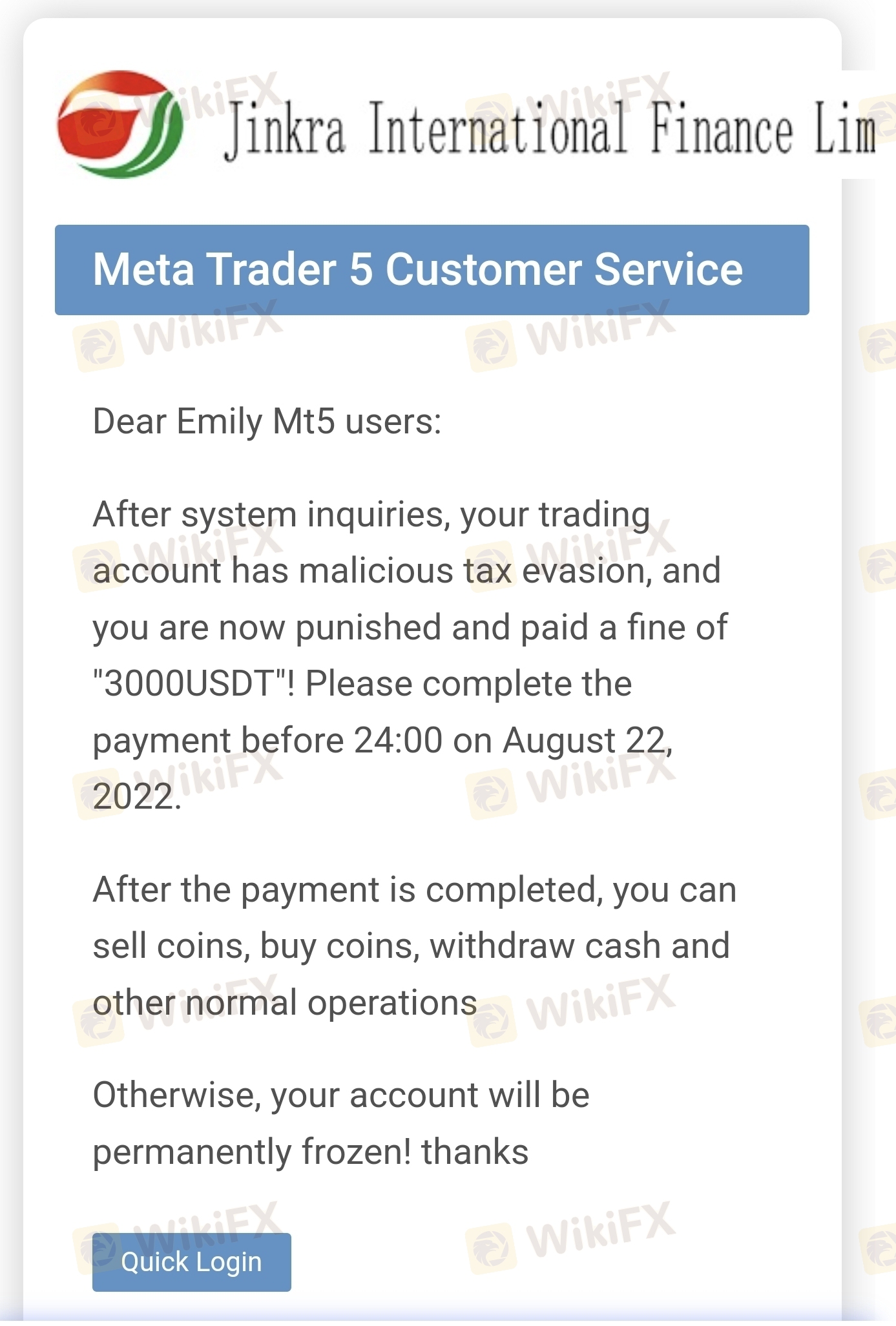 大家好。我想告訴你關于黑交易商的事 JINKRA有限公司是一個不能出金的詐騙平臺。在您將資金存入平臺并嘗試提取少量資金后,他們會退出以表明他們運作良好。但是當你有少量利潤時,他們開始要求對利潤征收 35% 的稅,并且不提取資金。我開始進一步交易,我的利潤變成負數 -1706 美元,之后我收到了來自平臺的一封信,說我被罰款 3000 美元,并威脅要封鎖我的賬戶。技術支持目前沒有回復網站上的電子郵件或實時聊天。幫我取回我的錢。