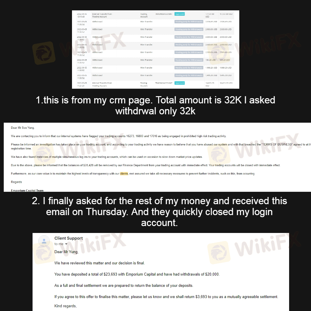 I didn't receive 32K from emporiumcapital its a very dangerous broker. My manager cheated on me and coveted the deposit of customers and their deal is for B-book. and they closed my client account and trading accounts. so i can't show from client page